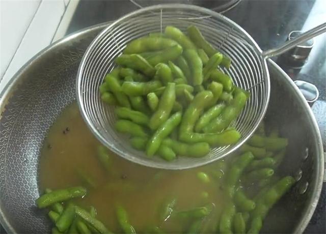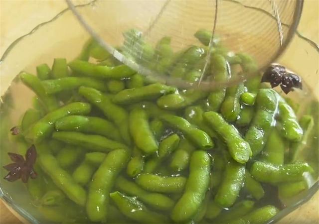 4.然后全部捞出来过一下凉水,泡凉以后就盛出来,不要一直在里面泡着,这时候煮好的毛豆就可以吃了。