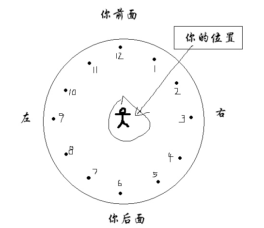 1、假如我现在站在你正右方,这时就说“我站在你的三点钟方向”。 2、假如我现在站在你正左方,这时就说“我站在你的九点钟方向”。(www.ws46.cOm) 3、假如我站在你的正前方,就说“我站在你的十二点或零点方向”。 4、假如我正好站在你后面,就说“我在你六点方向”。