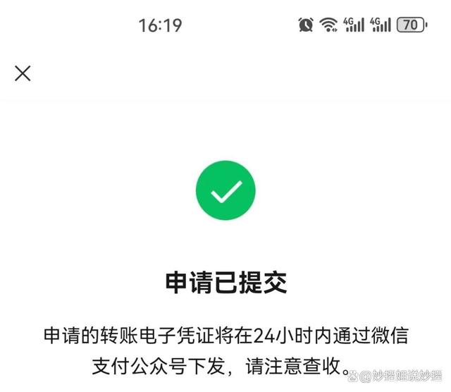 再点一次“提交”,稍微等一会儿,恭喜你,转账电子凭证就搞定了。系统会把带有公章的电子凭证发到你的微信聊天界面,你可以随时查看或保存,以备不时之需。