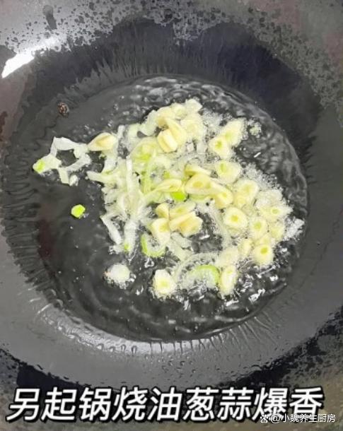 7:另外起锅,锅中加上少许食用油,加上蒜末和葱白,快速煸炒出蒜香味,倒入青椒丝,胡萝卜丝和黑木耳丝,快速煸炒至断生。