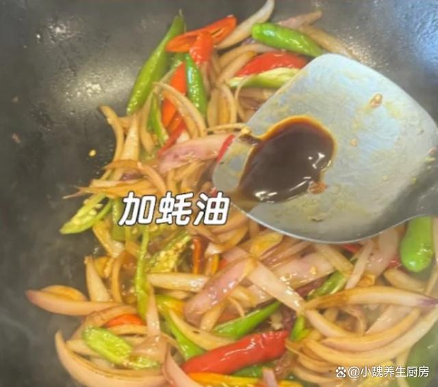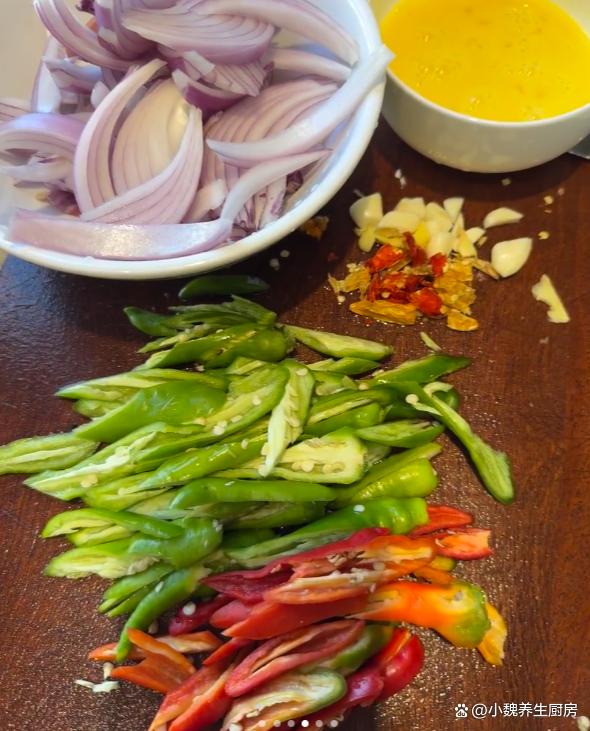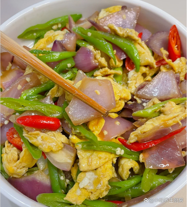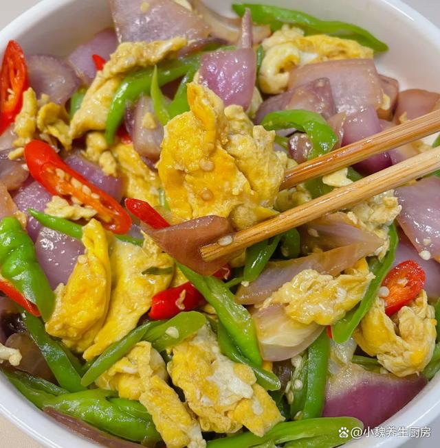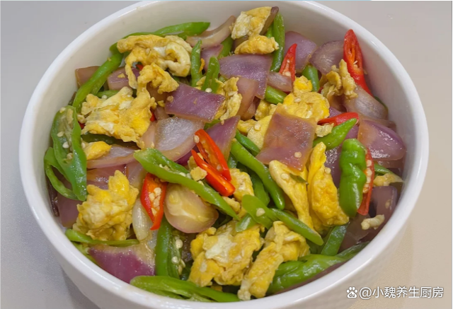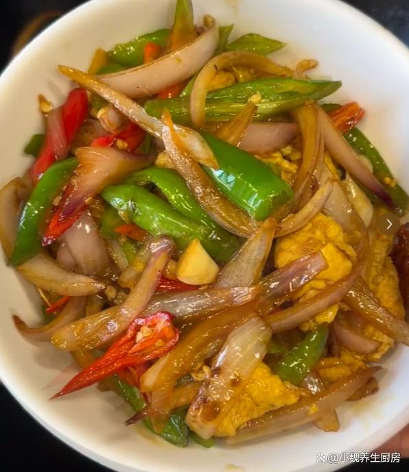 第八:加上半勺蚝油,最后倒入鸡蛋块,一起煸炒一会儿,滴入香油,装盘盛出即可,这道辣椒洋葱炒鸡蛋就制作完成了。 辣椒洋葱炒鸡蛋的制作小贴士:辣椒洋葱炒鸡蛋,这道家常菜以其鲜明的色彩、浓郁的香气和丰富的口感,成为了许多人餐桌上的宠儿。在制作这道菜时,除了遵循基本的烹饪步骤,还有一些小贴士能让你的菜肴更加出色。首先,选料要讲究。辣椒和洋葱应挑选新鲜脆嫩的,这样炒出来的菜品口感更佳。鸡蛋则要选择新鲜的,打散时可以加入少许清水和盐,这样炒出来的鸡蛋会更加松软可口。 其次,火候是关键。在炒制过程中,要先将辣椒和洋葱用中火炒至断生,保持其脆嫩的口感。随后,调至大火,迅速倒入蛋液翻炒,使蛋液与辣椒、洋葱充分融合,同时锁住食材的鲜味。再者,调味要适中。辣椒和洋葱本身带有一定的辛香味,因此在调味时要适量添加盐、生抽等调料,以免掩盖食材的原味。根据个人口味,还可以加入少许胡椒粉或鸡精提升菜肴的层次感。 最后,装盘要美观。炒好的辣椒洋葱炒鸡蛋色泽鲜艳,装盘时可以稍作摆盘,使其看起来更加诱人。 ·掌握了这些制作小贴士,相信你在家也能轻松炒出一盘色香味俱佳的辣椒洋葱炒鸡蛋。这道菜不仅美味可口,还能为你的餐桌增添一抹亮色,让家人和朋友都赞不绝口。各位网友们,你们是否吃过这道辣椒洋葱炒鸡蛋呢?(文中的配图都出自网络)