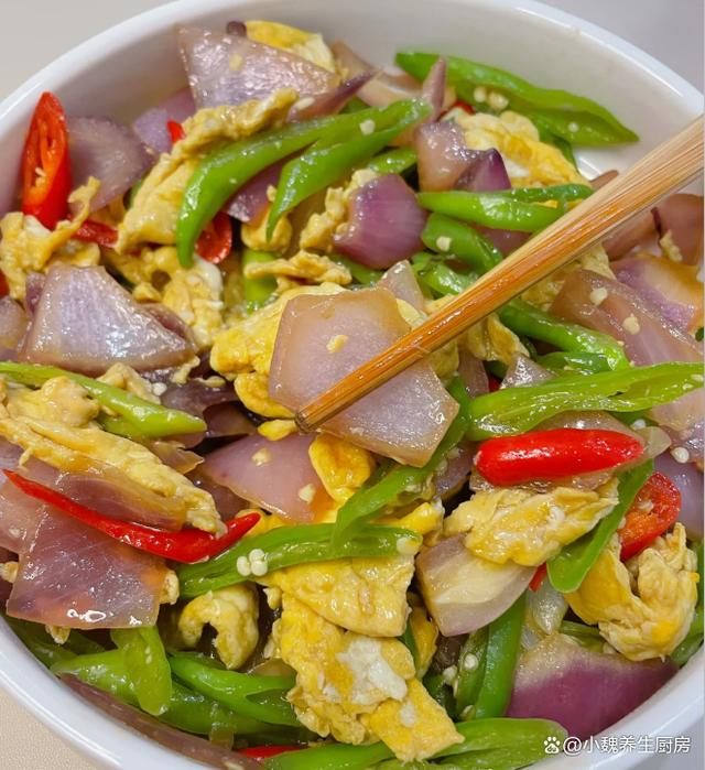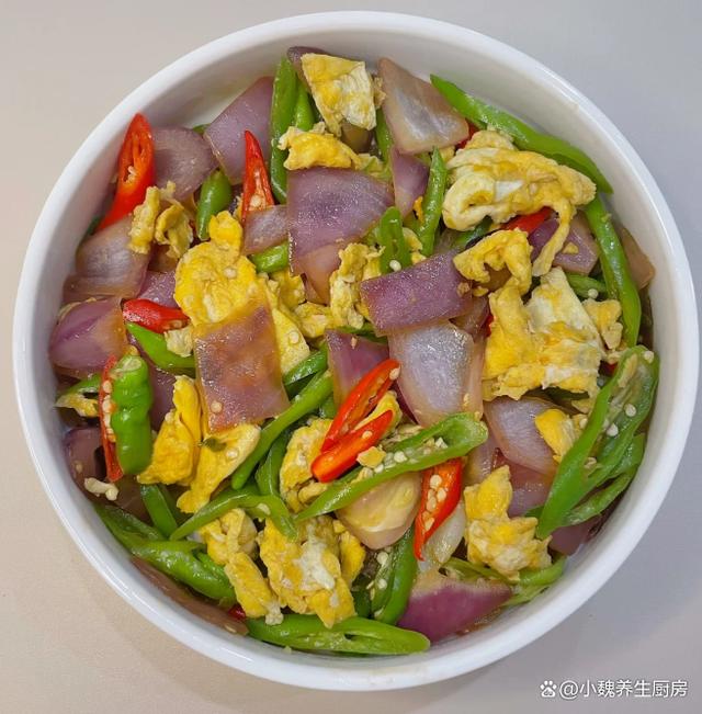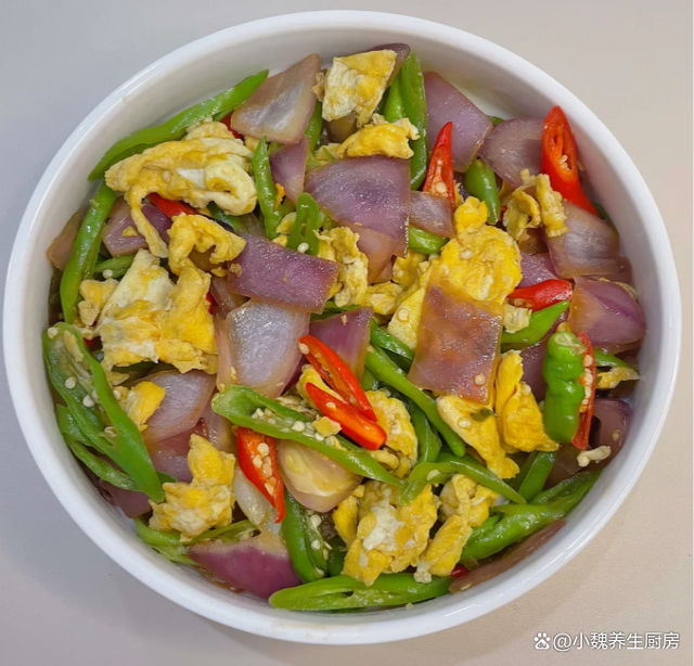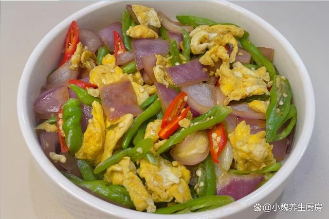 转眼来到今年的11月份,秋去冬来,季节更替,正是气温发生巨大变化的生活,我们的压力越来越大,工作也越来越忙碌,平常也没有时间吃饭,如果能够准点回家,一定要尝尝这道菜肴——辣椒洋葱炒鸡蛋,色香味俱全,吃起来很美味。11月,宁愿少吃猪肉,也要多吃这菜,解馋开胃,一家人都喜欢吃。  【辣椒洋葱炒鸡蛋的详细食谱】 准备一些食材:选购三个新鲜的土鸡蛋(鸡蛋是我们家孩子爱吃的食材之一,比肉类要便宜,富含丰富的蛋白质,土鸡蛋的色泽更好看,口感更嫩一些,是这道菜肴的首选),一个小米辣,青椒若干个,食用油若干,半勺白醋,少许水淀粉,干辣椒几个,一个新鲜的紫洋葱(洋葱是生活中最常见的配菜,洋葱的色泽好看,富含维生素,硒元素和微量元素,能够帮助疏通血管,平常可以多吃它),生姜和大蒜少许,少许生抽和蚝油,食盐若干,胡椒粉半勺,其他。 详细制作过程: 第一:提前准备好洋葱,青红辣椒和鸡蛋等食材,生姜和大蒜切成细末,干辣椒洗净切成小段,备用。第二:去掉紫洋葱的外皮,切掉洋葱的根部,从中间切开,然后顺着切成细丝,洋葱丝可以用盐水浸泡,洗净控干表面的水分。第三:把青椒洗干净,去掉蒂和籽,斜切成若干细丝,小米辣也洗净切丝,放在碗中备用。第四:空碗里打入几枚土鸡蛋,先把蛋液迅速搅散,加上半勺白醋(主要是去掉蛋腥味),加上少许清水或水淀粉,加上少许食盐调味,把鸡蛋液充分调味好。 第五:锅底加上少许食用油,让油温烧热乎,倒入提前倒入锅中,开中小火慢慢煎,让蛋液微微成型,用锅铲分成若干小块,装在碗中备用。
