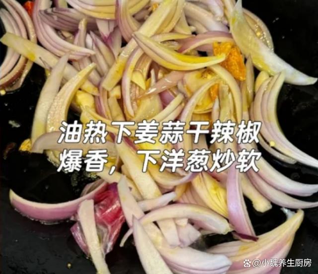 第六:锅中继续烧热,加上少许食用油,放入蒜姜和干辣椒,快速爆炒出香味,将洋葱丝炒到变软。 第七:放入一些青红辣椒,将辣味都炒出来,加上少许食盐,味极鲜酱油和白糖,加上胡椒粉半勺,迅速翻炒均匀。