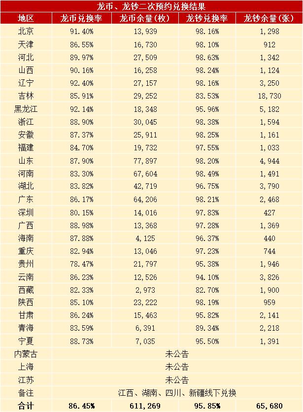 最后也有人发现,部分批量预约的,被通知预约无效,当然就无法兑换了,这是好事。 还能预约吗现在各地二次预约的结果基本公布,剩余数量并不少,还有差不多61.1万枚龙币和6.6万张龙钞。 这些龙年币钞,虽然是被放弃兑换,但还是有很多藏友,想要却预约不到。那么剩余的数量,会怎么安排呢? 它们可能是会上缴进行封存处理。