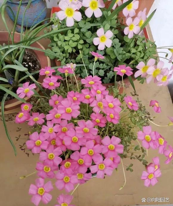 三角梅,凌霄花,三角梅和凌霄花这两种植物都是爬藤类的植物,如果有附着生长的墙壁,他们可以无限制的攀爬和生长,两种植物的生长习性基本上差不多,只不过南方地区更加适合养三角梅。而北方地区更加适合养殖凌霄,两种植物我都养过,都是非常皮实且容易养护的植物。 二类:酢浆草,风雨兰,这两种植物都属于球根植物,在球根植物中属于偏小型的,球根类的植物生命力都很强悍,种在花盆里,放在室外基本上不用去管,即使长时间没有水分也照样不会干枯死亡,顶多叶片会枯萎,遇到水分之后很快就会再继续恢复生长。