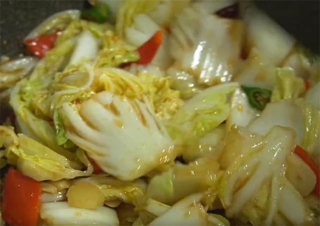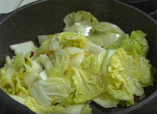 5.锅里油热下入蒜姜干辣椒,先把香味炒出来,再把撕好的白菜下锅,这一步炒白菜一定要用大火翻炒一分钟左右,这样可以尽量减少白菜出水口感,也会更清脆,像这种稍微变软的状态。
