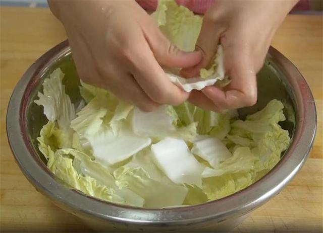 1.大家好,好久没吃白菜了,今天花四块钱买了一颗,用它做道特别简单下饭的家常菜。先把白菜叶子一片片掰下来,再用流水冲洗干净,把洗干净的菜叶下手撕成块,不需要用刀切。