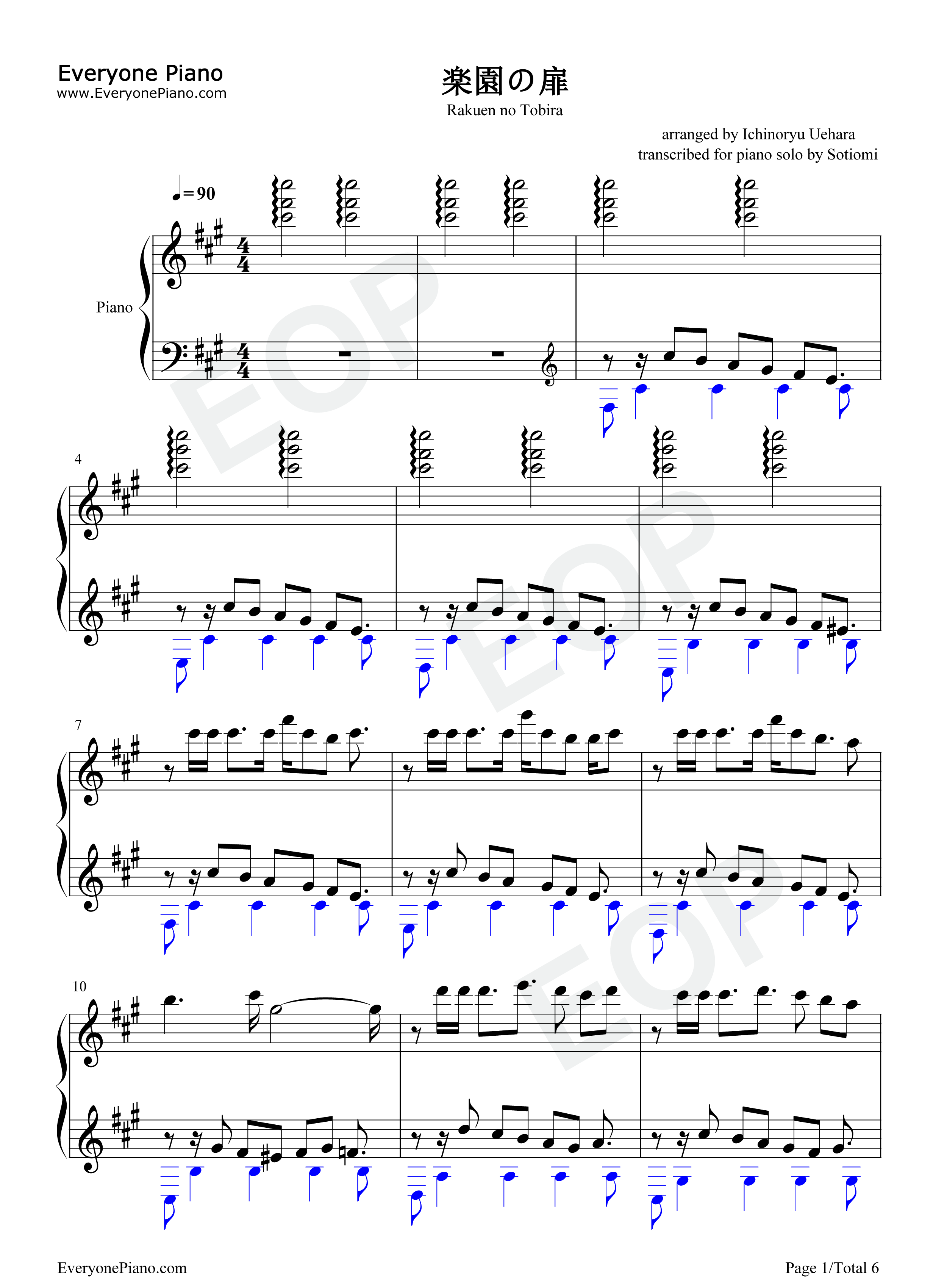 是CLOCKUP公司于2011年6月24日发表的18禁恋爱冒险游戏《euphoria》的片头曲。2011年12月22日时发表了该作品的OVA“euphoria ~真中合歓 地狱始动编~”。 楽园の扉是由青叶林檎演唱,Takt-W 作词,上原一之龙作曲编曲的。青叶林檎(或者青叶苹果)(4月5日-),日本女性配音演员、歌手。出身于鹿儿岛县。隶属于Rock"n"Banana,主要是在**游戏业界活动。 这里我们提供楽园の扉钢琴谱,希望大家喜欢。 |