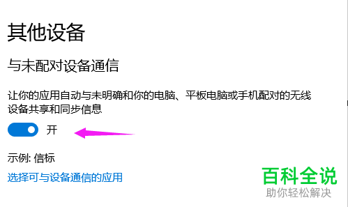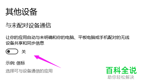 5. 第五步在右侧页面中,根据下图箭头所指,发现【与未配对设备通信】选项设置为【关】。