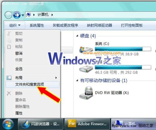 很多国产的浏览器都有防假死功能,那么,何谓防假死?你有没有碰到Windows系统整个卡住的情况,好比打开一个含电影较多的文件夹时资源管理器卡住了,其他文件夹窗口也不能操作了。 有没办法让Windows7、Vista的资源管理器也能做到防假死防卡死呢? 当然能,其实解决办法就在眼前,非常的简单,大家跟着Win7之家一起来搞下吧—— 具体步骤 1 1、随便打开个文件夹或者Win键 E键直接打开计算机,然后在资源管理器这个窗口左上方,依次点击“组织”、“文件夹选项” 文件夹和搜索选项