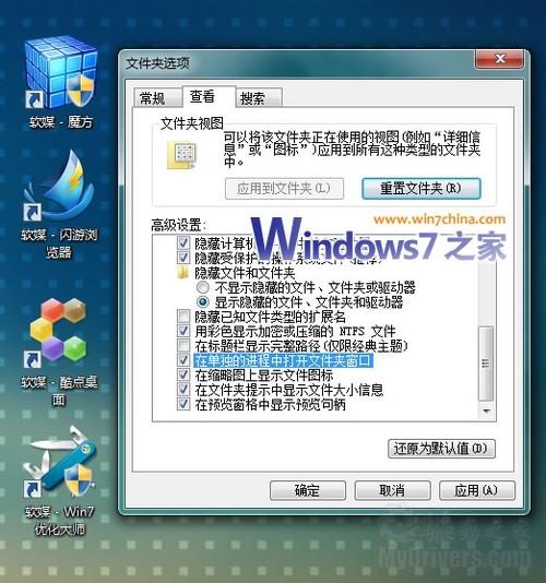 2 2、在打开的“文件夹选项”这个窗口里面,点击“查看”,找到“在单独的进程中打开文件夹窗口”这个,勾选上,点击确定即可。 文件夹选项