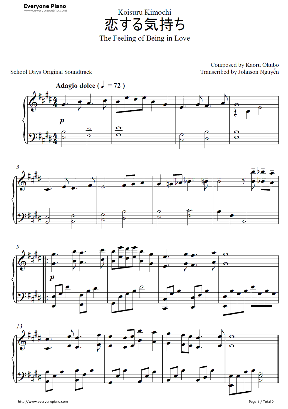 是TNK公司制作的动画作品School Days的片尾曲。School Days(スクールデイズ)是2005年4月28日由Overflow发售的十八禁游戏。电视动画《日在校园》改编自2005年4月28日由Overflow发售的同名十八禁游戏,于2007年7月3日开始播放。 12月,日本门户网站GOO给出的年度搜索排名,本作位于2007年播放的动画的动画搜索排行榜第11位。 这里我们提供恋する気持ち钢琴谱,希望大家喜欢。 |