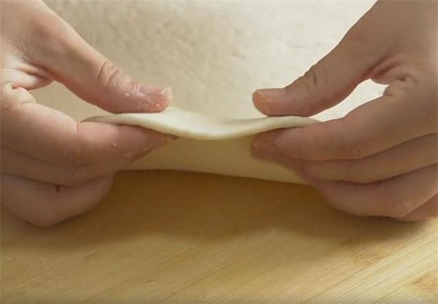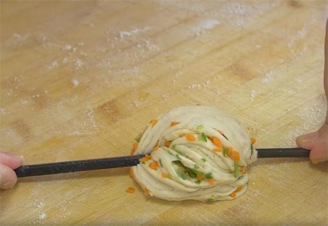 5.用筷子从中间压一下,然后把它拉的更长一些,注意不要拉断,再给它翻个面,筷子放中间,面剂两头对折,捏住一头,把筷子旋转一圈,再往下压一压,这样一个小花卷就做好了。