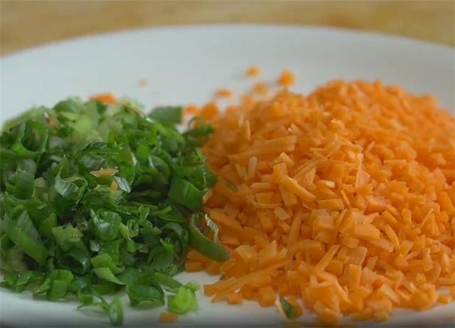 2.洗净的胡萝卜切片切丝,再切成小碎末,再切一点葱花备用。