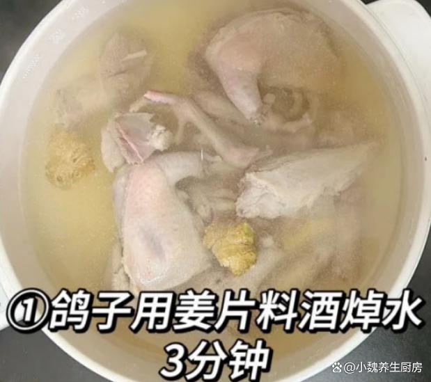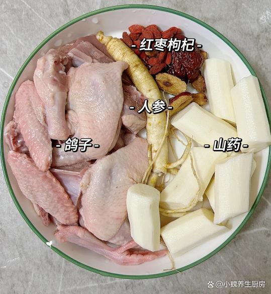 已经到了11月份了,秋冬正在交替,虽然已经入冬,但是还是秋天的气候,天气也越来越冷,导致空气里很干燥,皮肤粗糙,经常出现气色差,抵抗力非常差,疾病也会找上门。冬季来临以后,这个时候要尊重时令,少吃辛辣油腻的菜肴,建议要清淡饮食,多吃一些新鲜蔬菜,平常可以尝一尝各种鲜汤,补充营养的同时,让营养更容易被消化。今天准备用鸽子,人参和山药制作一款靓汤——人参山药红枣炖鸽子汤,简单炖一锅,汤品特别温补,让人气色越来越好,有了强壮的身体,疾病才会绕着走。许多人还没有喝过这款人参山药红枣炖鸽子汤,应该如何烹饪呢?不如来看一会儿哦。冬季一碗汤,医生不用帮!建议多喝这汤,补充元气,安稳过冬。  【人参山药红枣炖鸽子汤的制作技巧】 准备一些食材:选购几个人参(人参是一种很补的食材,以前很多人觉得贵,现在基本上都吃得起,可以用来煲汤,让身体越来越强壮),生姜一大块,选购两根新鲜的淮山药(山药又叫山芋,是一种粗细均匀的根茎蔬菜,里面的果肉非常洁白,口感清甜脆爽,山药可以炒着吃或煲汤,保护肝肾的健康,平常要多囤一些,常吃对身体有好处),若干个红枣,枸杞子少许,新鲜乳鸽1-2个,冷水和温水若干,料酒适量,枸杞子少许,食盐若干,一丢丢胡椒粉,其他。