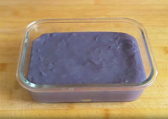 6.准备一个合适的模具,里面加点凉开水,晃动一下,让侧面都能沾上水,然后把水倒掉,再把熬好的紫薯糊趁热全部倒进去,用一个沾上凉开水的勺子把表面涂抹平整,自然放凉以后再放冰箱冷藏一会儿,口感更好。