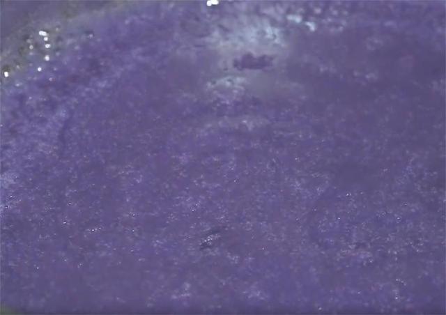 4.锅里无水无油,倒入打好的紫薯糊,50克冰糖,先用中火熬一会儿,让冰糖完全融化,等紫薯糊变成这种温开状态。