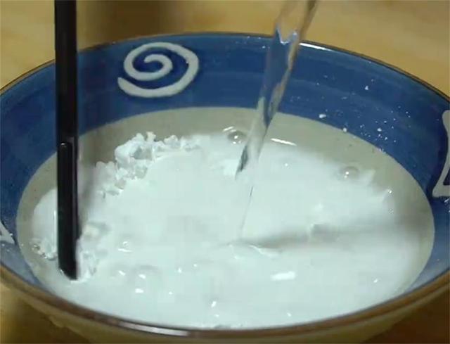 3.准备个小碗,加入100克豌豆淀粉,200毫升清水,用筷子多搅拌一会儿,搅到没有干淀粉颗粒就行了。