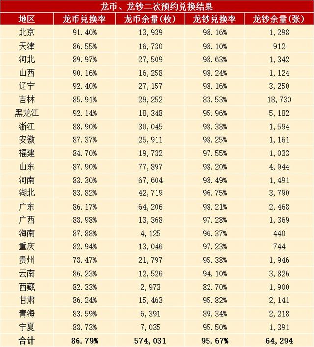 从公布的数据中,我们可以发现,各地龙币的平均兑换率在86.79%,一共剩下了574031枚龙币。龙钞的兑换率比较高,达到了95.67%,一共是剩下了64294张龙钞。 两者总计是超过63.8万。再加上还有部分地区没有公布数据,总计剩余数量还是比较多的。
