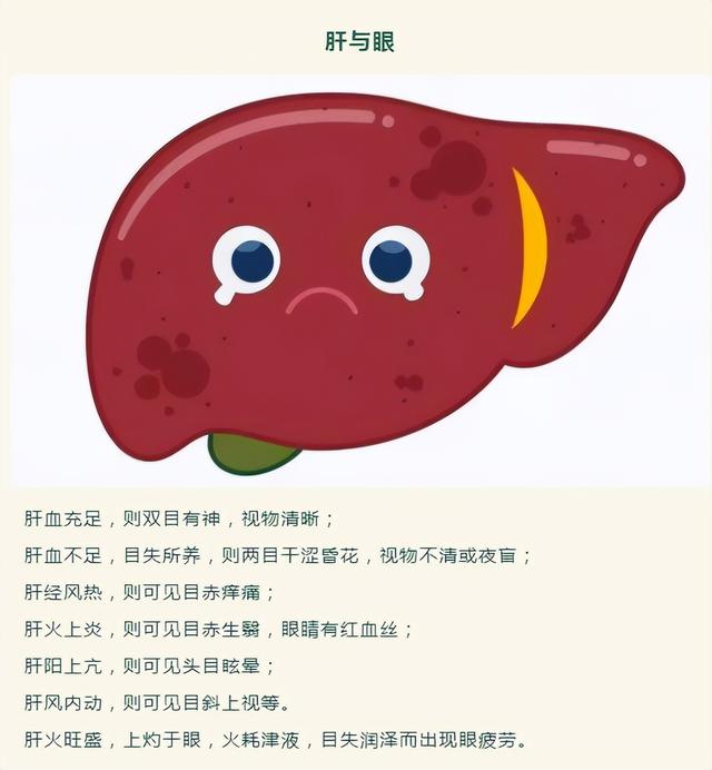 《黄帝内经》中说:“肝受血而能视,肝气通于目,肝和则目能辨五色矣。”眼睛是否舒服,和我们的肝有很大关系,一双明亮有神的眼睛,是靠着肝血滋养出来的,肝血充足,肝火平衡,双眼明亮水润,目失所养,眼睛就容易干涩,看不清。 肝和眼睛的具体关系,放在下图了,我们可以对照看看,自己属于哪一种。