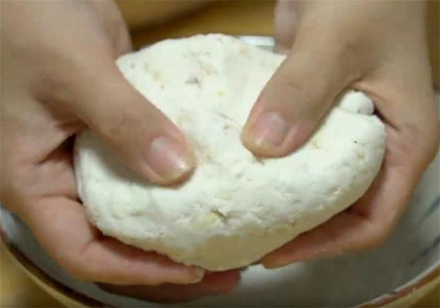 4.根据自己的喜好加入适量的白糖,搅匀以后分次加入适量的糯米粉,大家用的山药和苹果的量不同,糯米用量也会有区别,加的时候一定要分次来,一次别加太多,搅成絮状以后下手揉成团,不需要像面团一样揉的特别光滑,像这种中等软硬的程度就行了。