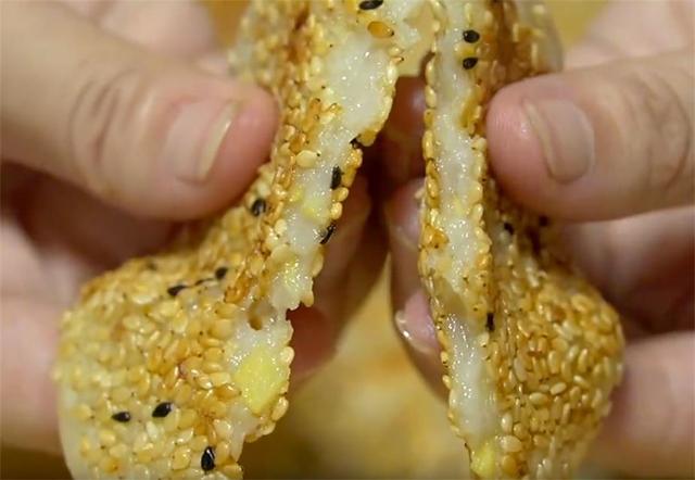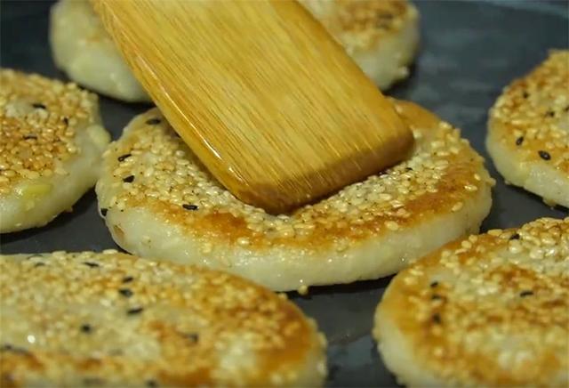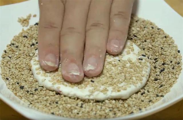 5.揪一块糯米团,先用手抓几下,然后用手心团成圆球,再用力压成一张圆饼,接着再放到装熟芝麻的盘子里按压几下,让两面都沾上芝麻。(www.ws46.cOm)