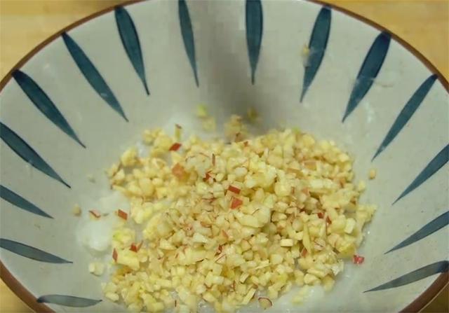 3.准备一个洗净的苹果,不需要去皮,切片切丝,再切成小碎丁,也装在放山药的碗里。