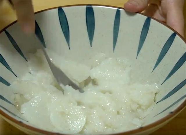 2.全部倒在一个大碗里,用叉子压成细腻的山药泥。