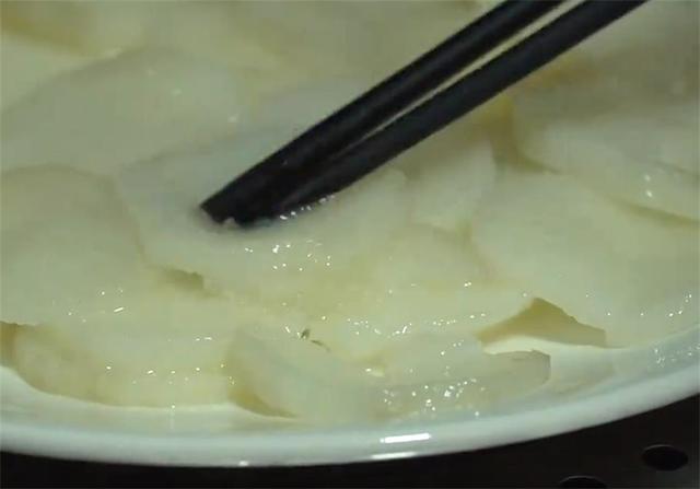 1.大家好,今天用山药和苹果做好吃的,也是非常简单快速有营养的早餐。山药先把外皮去掉,然后切成薄片,对山药比较敏感的朋友,做这两步一定要戴上手套,凉水放进蒸锅,水开后大火蒸十分钟,蒸好以后可以用一根筷子试一下,能轻轻穿透就行了。