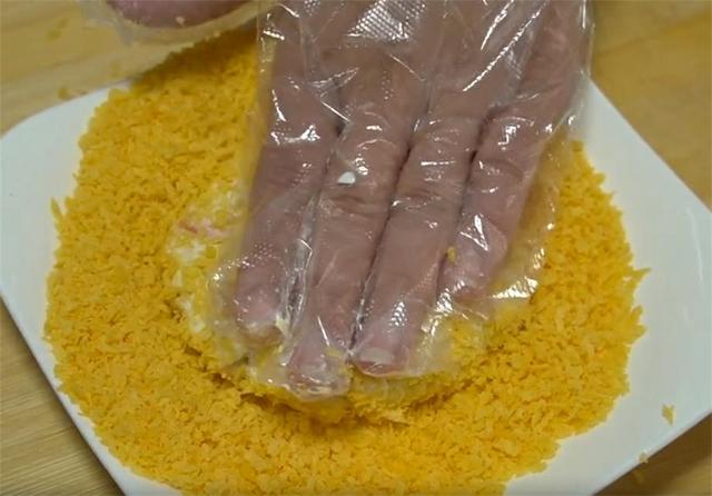 5.这样依次把所有的糯米团做好,再把饼子放到牛奶里滚一圈,最后放到面包糠里,让两面都粘上面包糠,用手压一压,这样粘的更牢固一些。