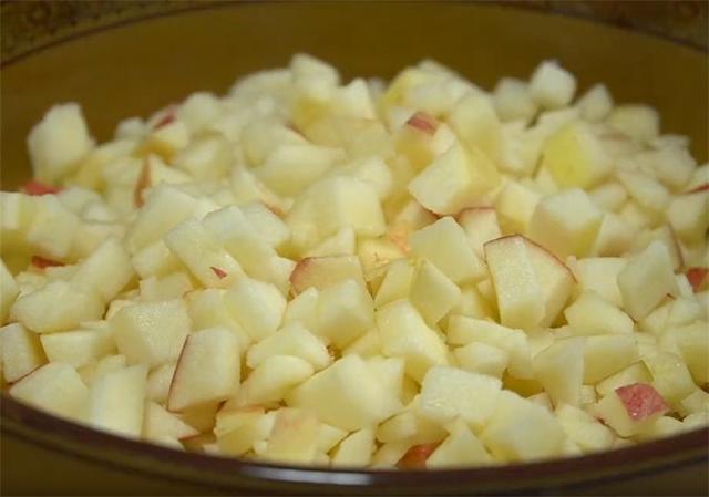 2.洗干净的苹果切成片,不要切的太薄,切条再切成丁,这些苹果丁,大约300克,切好后装入大碗中。