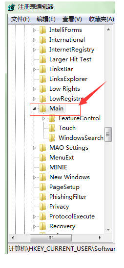 按照左侧的侧三角,依次展开文件夹菜单:HKEY_CURRENT_USER\Software\Microsoft\Internet Explorer\Main
