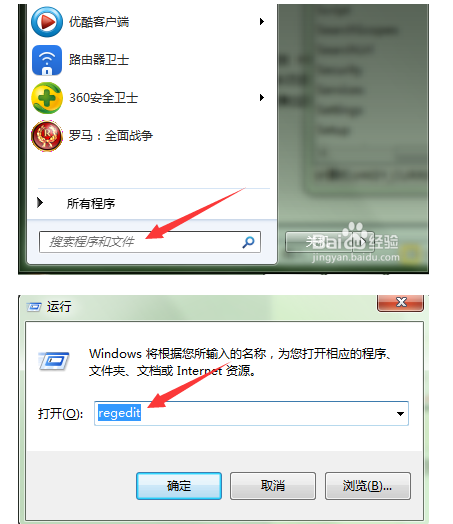 点击“开始”——在搜索程序和文件里输入“regedit”(注册表编辑器);或者直接按键win R,调出”运行“,输入regedit。