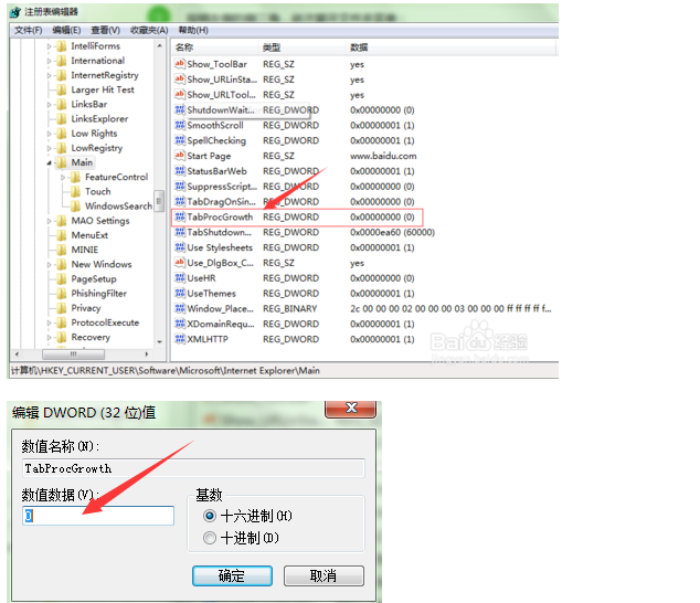 选中”Main“右侧会显示子内容。从中找到”TabProcGrowth“,并双击打开,将数值数据设置为”0“或者”1“。TabProcGrowth赋值为1,则表示允许系统最多可允许IE出现两个进程,如果赋值为0,则表示IE只能有一个进程。一般我们设置为”0“。