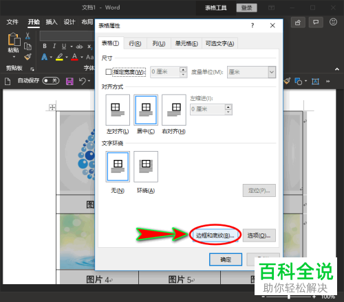 6. 将我们的图片全部插入完全之后,我们的图片就已经排版完成了。然后我们就可以将多余的表格去除了。首先我们使用鼠标全选表格,然后鼠标右击,在打开的菜单中点击表格属性,进入到表格属性窗口之后,点击下方的边框和底纹选项。