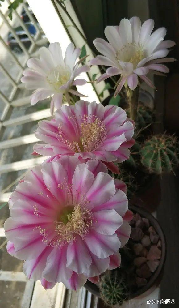 我老家的阳台上放了几棵仙人球,一时间也都完全忽略掉了,突然之间就发现这几天他们已经开花了,虽然零零散散只开出几个花苞,开出来的花瓣还是非常漂亮的,秋天盛开的仙人球也照样是可以进行对它授粉的,用棉棒相互授粉,到了明年春天就可以收获种子了。 不同品种的仙人球进行相互授粉,所繁殖出来的后代也都各具特色,这也是养殖仙人球的一大乐趣。 |