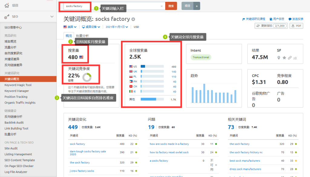 这里建议使用Semrush工具来做统计,注册后可以免费使用七天。 2.3开始使用关键词搜索在SEMRUSH工作界面输入你提前收集好的关键词。如图所示位置会出现我上一个章节所说的要记录的四个指标,分别录入表格即可。