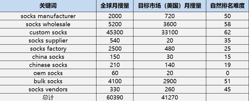 我用袜子这一类目来做案例示范。因为袜子的最终使用者是C端普通消费者,那么我们在做关键词搜索时要在产品词后加上各种B端商务词来进行搜索。最终我们得到了下面这样一张表格。