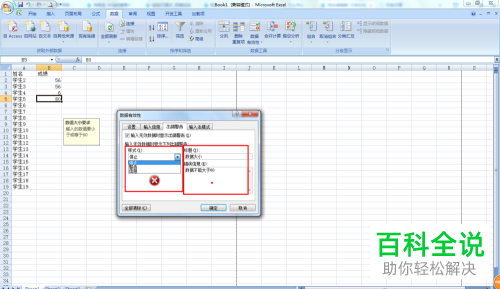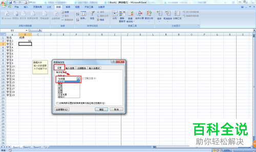 2. 在弹出的窗口中,点击左上角的设置选项,在允许下,选择”任何值“(或者按照自己的需要设置其它要求)。Tips:因为此处的成绩有整数也有小数,所以选择任何值。