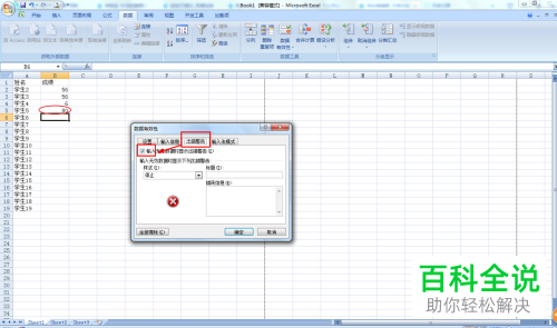 4. 然后设置输入错误的警告信息,切换到”出错警告“选项下,勾选上输入无效数据时显示下列出错警告的选项。
