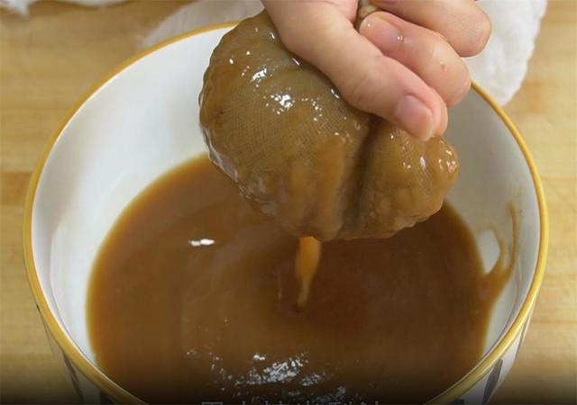 7.然后倒在一个干净的纱布里,用力挤出梨汁。