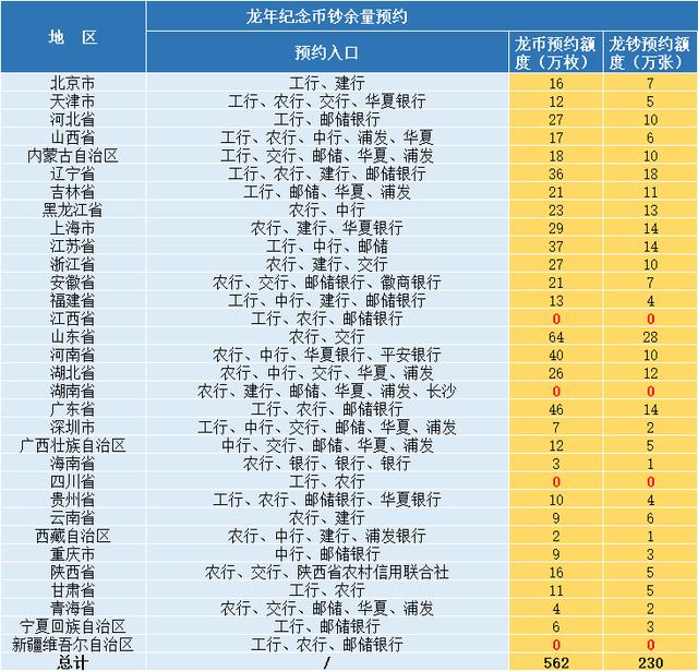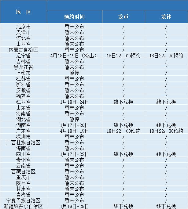 龙年币钞均为4月18日开始为期2天的预约。龙币是22点预约,龙钞是22点30分预约,两者分时间段开约! 同时,它们没有核实期,且兑换时间相同,都是20号到24号。 其次是预约和兑换额度,龙币每人可以兑换20枚,龙钞每人可以兑换10张!代领人数减少到2人。 这虽然是广东地区的安排,但业内普遍认为,全国各地预计是同一个时间开始预约。摘自: www.ws46.com 各地安排情况已经整理好了。