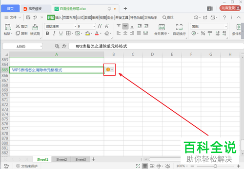 3. 第三步,将单元格中的内容选中,接着点击箭头所指的感叹号图标。