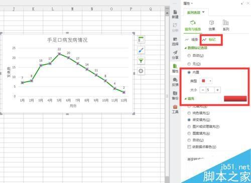 第七,在属性上点击填充与线图,然后点击线图,可以线图的颜色,透明度,大小等等。。。同时也可以点击标记,添加内置标记,设置颜色大小等等。