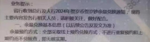 目前,又有新的消息传出,一张工作通知的照片在流传在外,其中明确提到了龙年币钞二次预约的预约方式、时间等具体安排。 需要事先提醒的有两点,一是具体安排还是要以后续公告为准。二是各地安排不同,仅做参考。 那么我们接下来,就看看是什么样的安排吧。 二次预约安排流出目前,有一张关于龙年币钞余量兑换工作内容安排的照片流出。