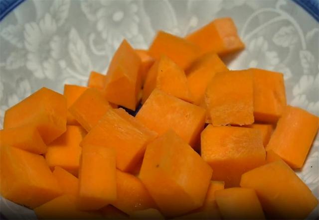 2.一根洗净的胡萝卜切片切条,再切成小丁备用。