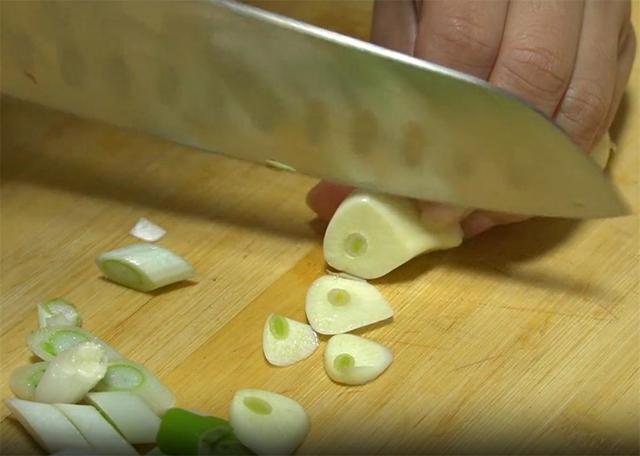 4.再准备适量的大葱,切成葱花,大蒜切成片。