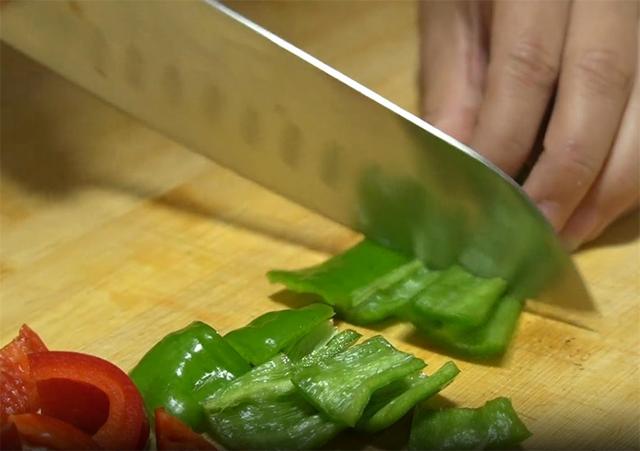 3.青红椒各一个,去籽以后切成片。