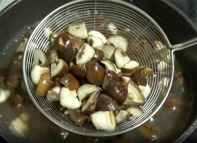 6.再把香菇也倒进去焯水两分钟左右,这样焯水以后可以去除菌类食物的异味,也能减少炒制的时间,焯好以后捞出来控水备用。