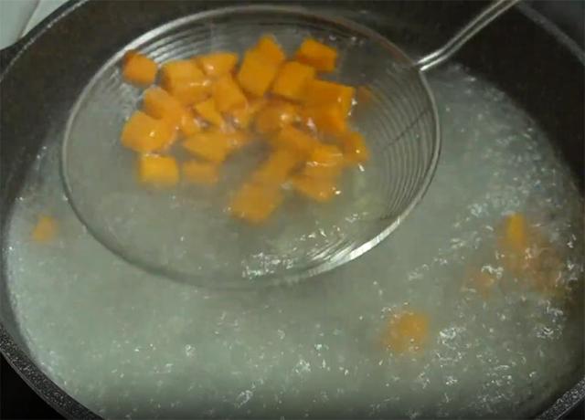 5.锅里水烧开,加一勺盐,几滴食用油,先把胡萝卜下锅焯水两分钟,捞出来备用。